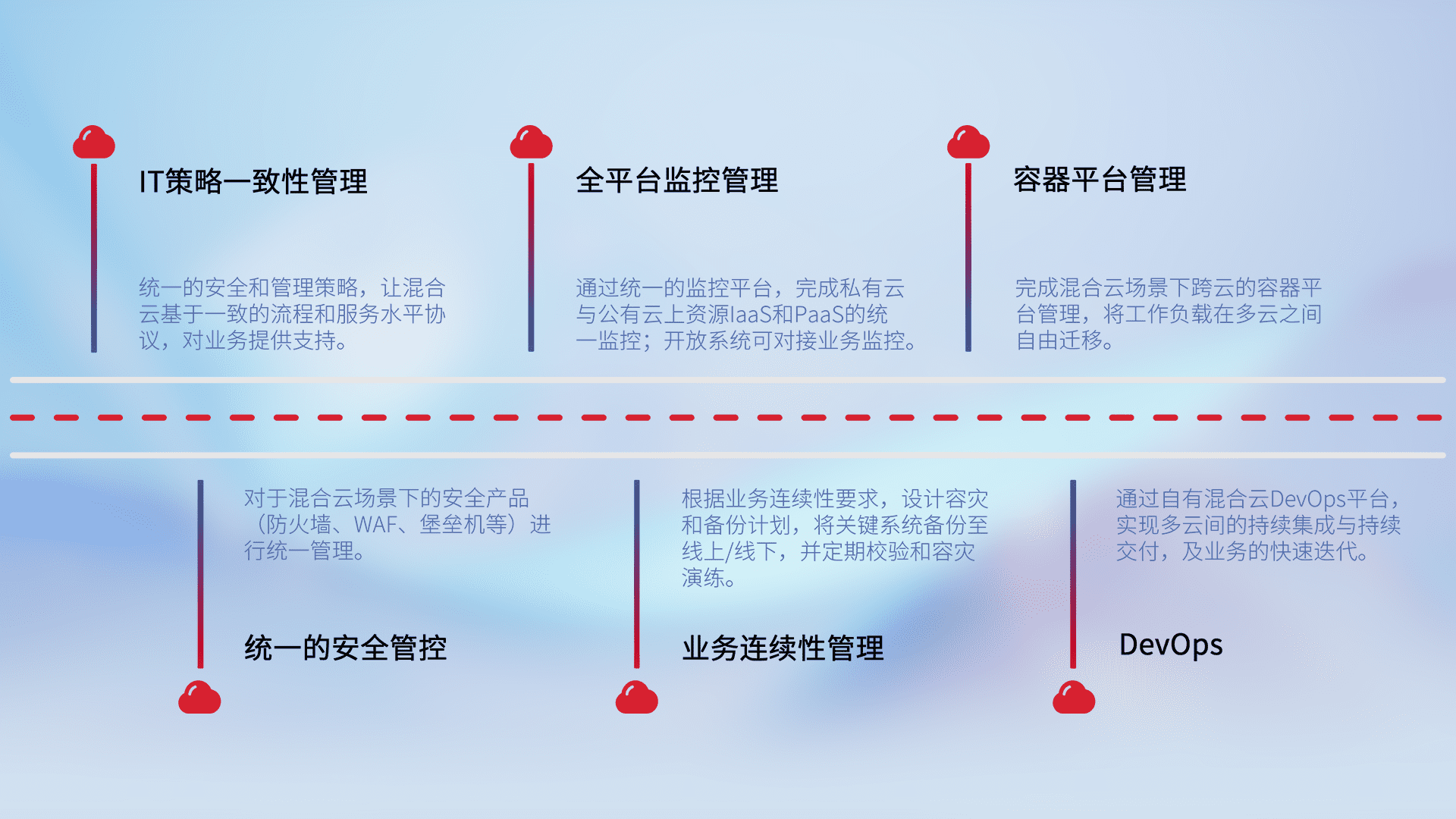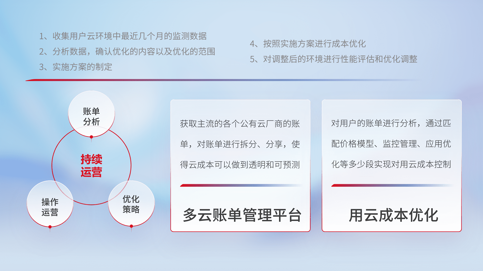 通过多云纳管,,,以统一的资源数据模型把客户的云资源进行抽象和封装,,进而实现对多云资源的统一操作,,,,保障云资源管理的可靠性、、、、稳定性与可用性。。。。量身定制化运维内容,,,配置、、、、开发运维、、补丁管理、、、备份、、监控、、、、认证和访问管理、、、审计和日常巡检等,,,保障在用云过程中的可靠度,,稳定度以及高可用率。。。