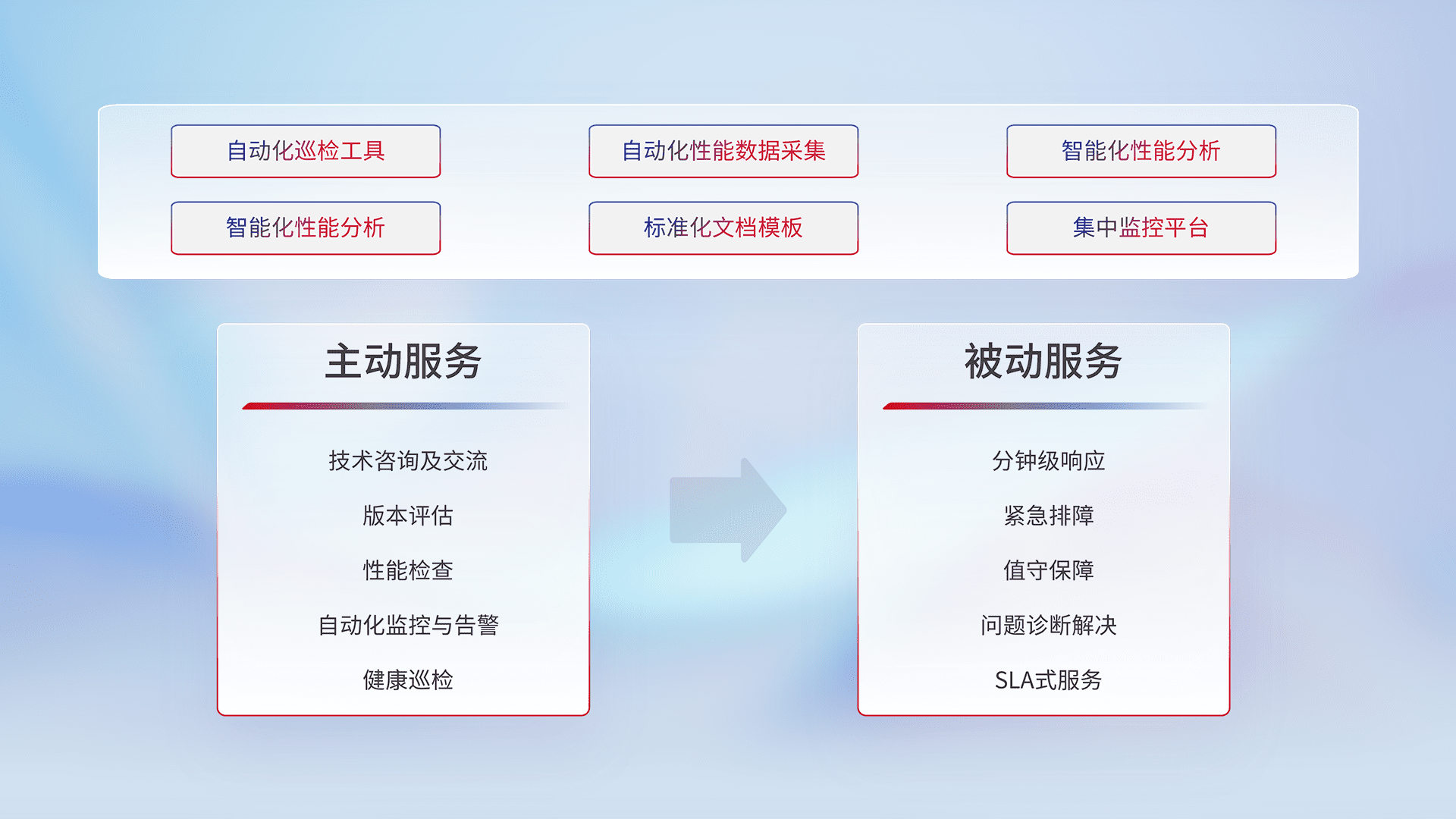 智能化工具和标准化文档,,,,保障服务质量,,提供主动服务(包含技术咨询、、版本评估、、性能检查、、、自动化监控与告警、、、、健康巡检)和被动服务包含(分钟级响应、、紧急排障、、、值守保障、、、、问题诊断解决、、、SLA服务)。。。